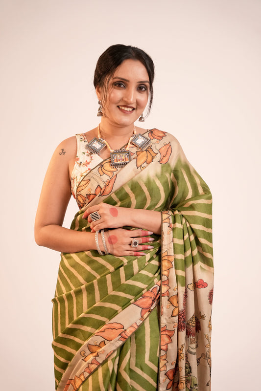 SUNDARBAGH- Green Fusion Print Tussar Silk Saree
