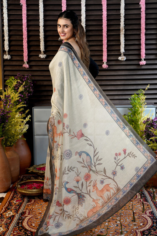 VANIKA - Mint Green Chanderi Saree with Deer & Floral Details
