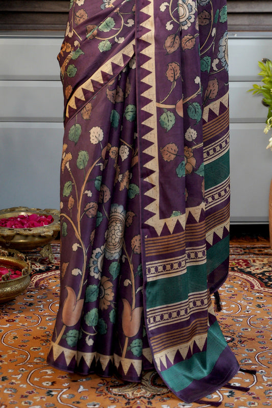 RANGREKHA – A Purple Tussar Silk Saree with Hand-Painted Florals & Motifs