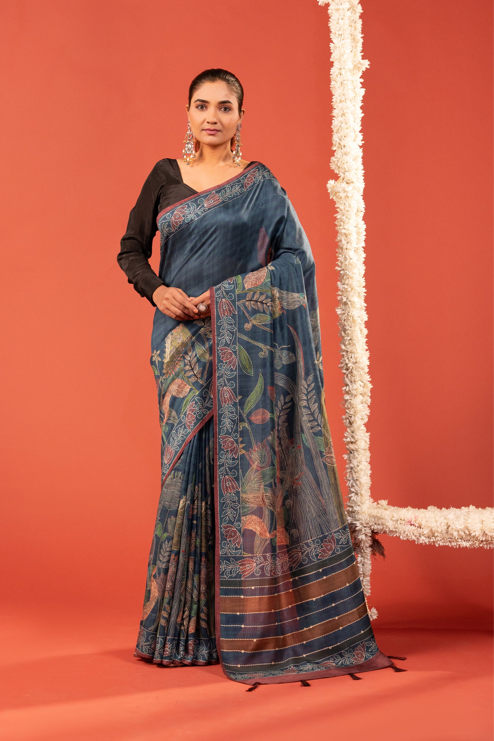 Woven in rich indigo tussar silk, this saree features delicate floral katha work traced like hand-drawn sketches across the body. Earthy, artistic, and quietly powerful—this one’s for days when you want your saree to speak softly but stay unforgettable.
