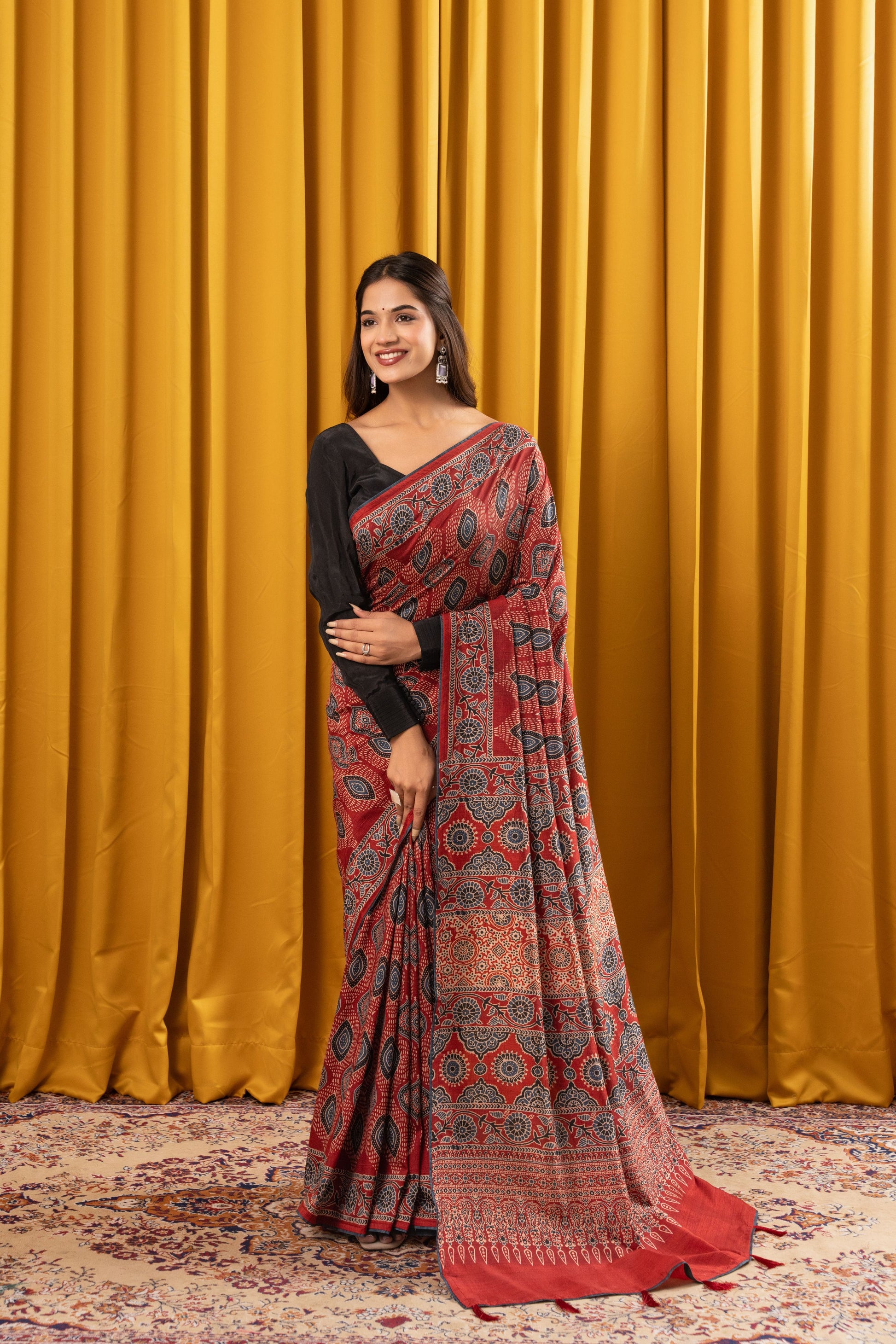 SINDOORI- Red Ajrakh Tussar Silk Saree