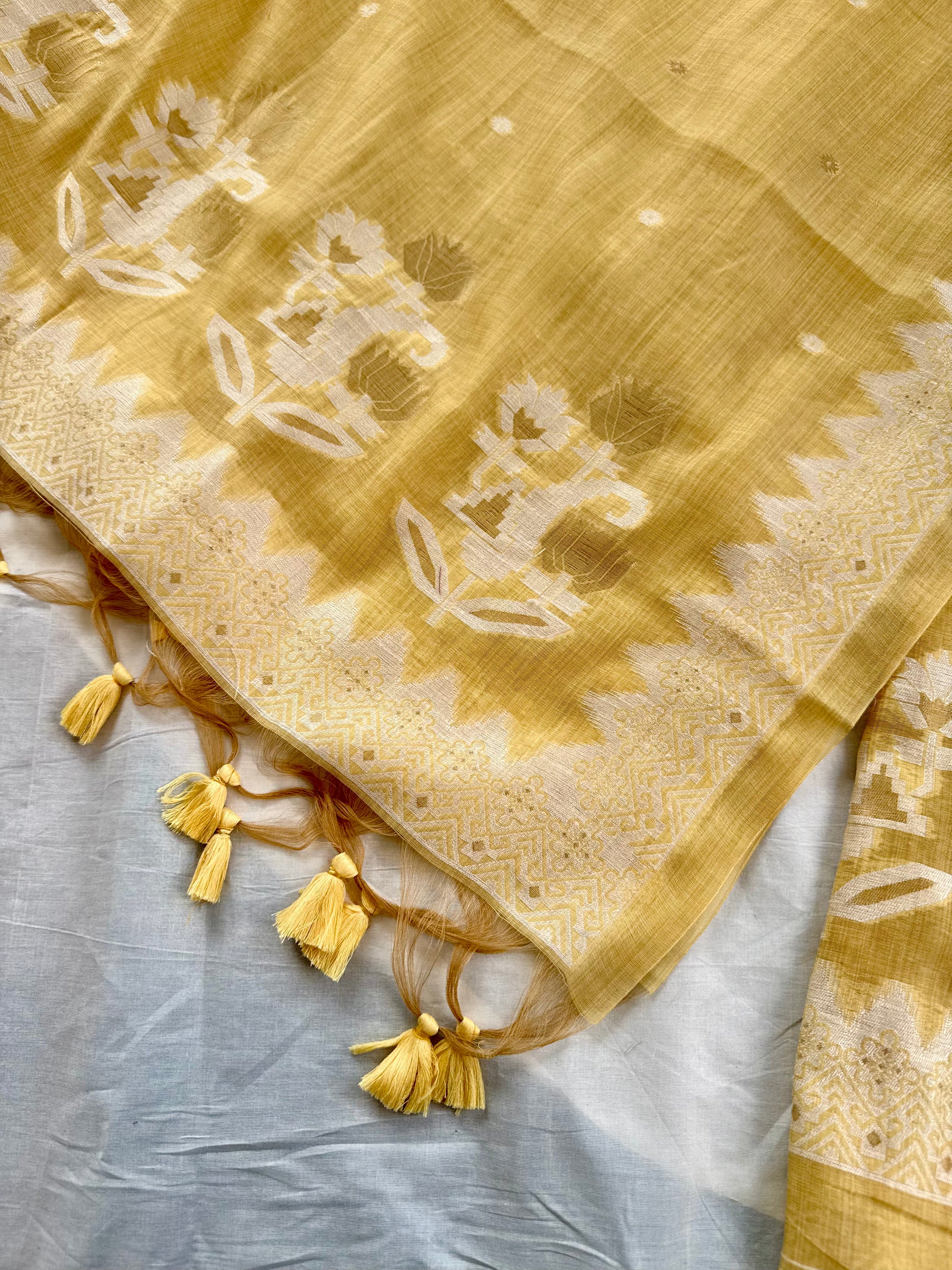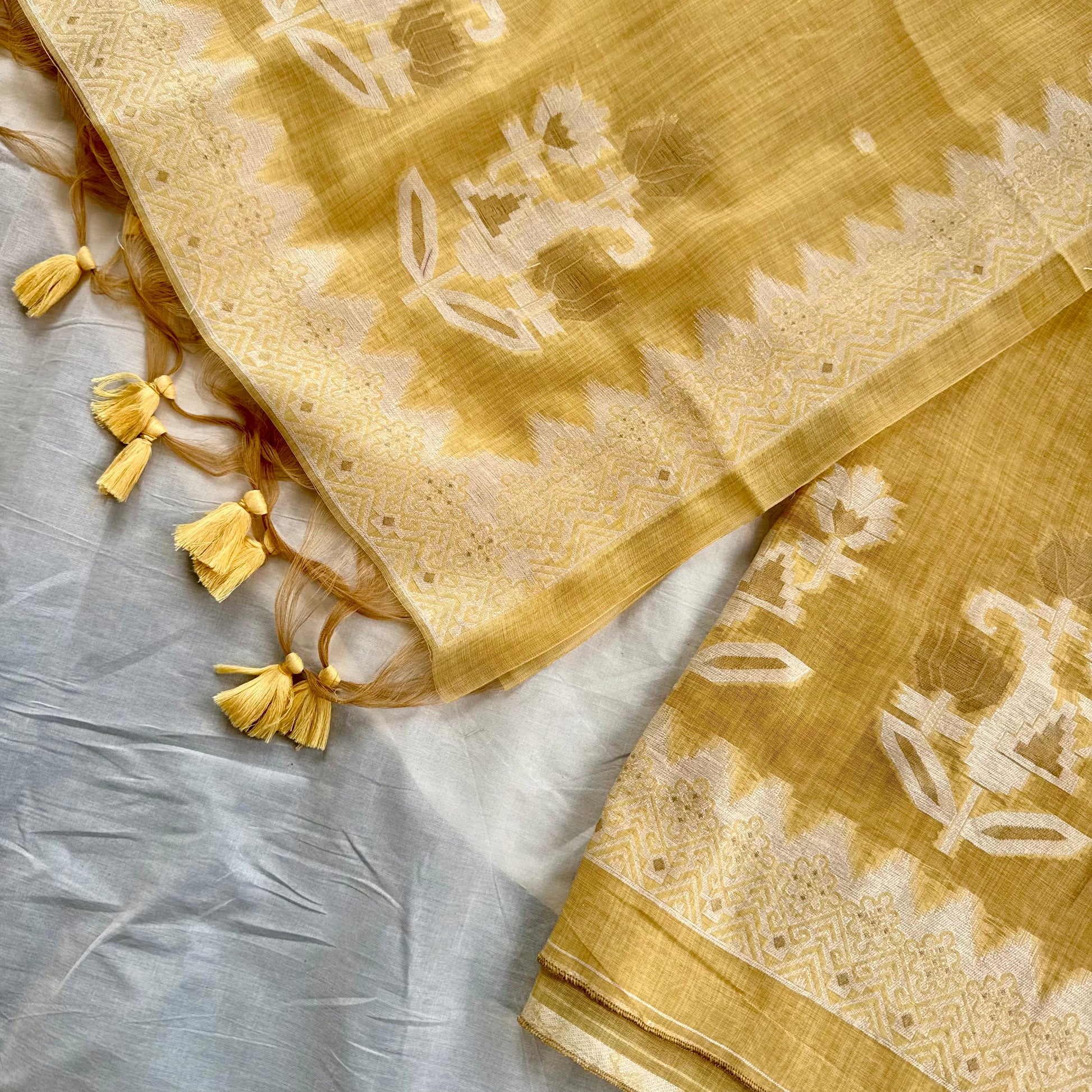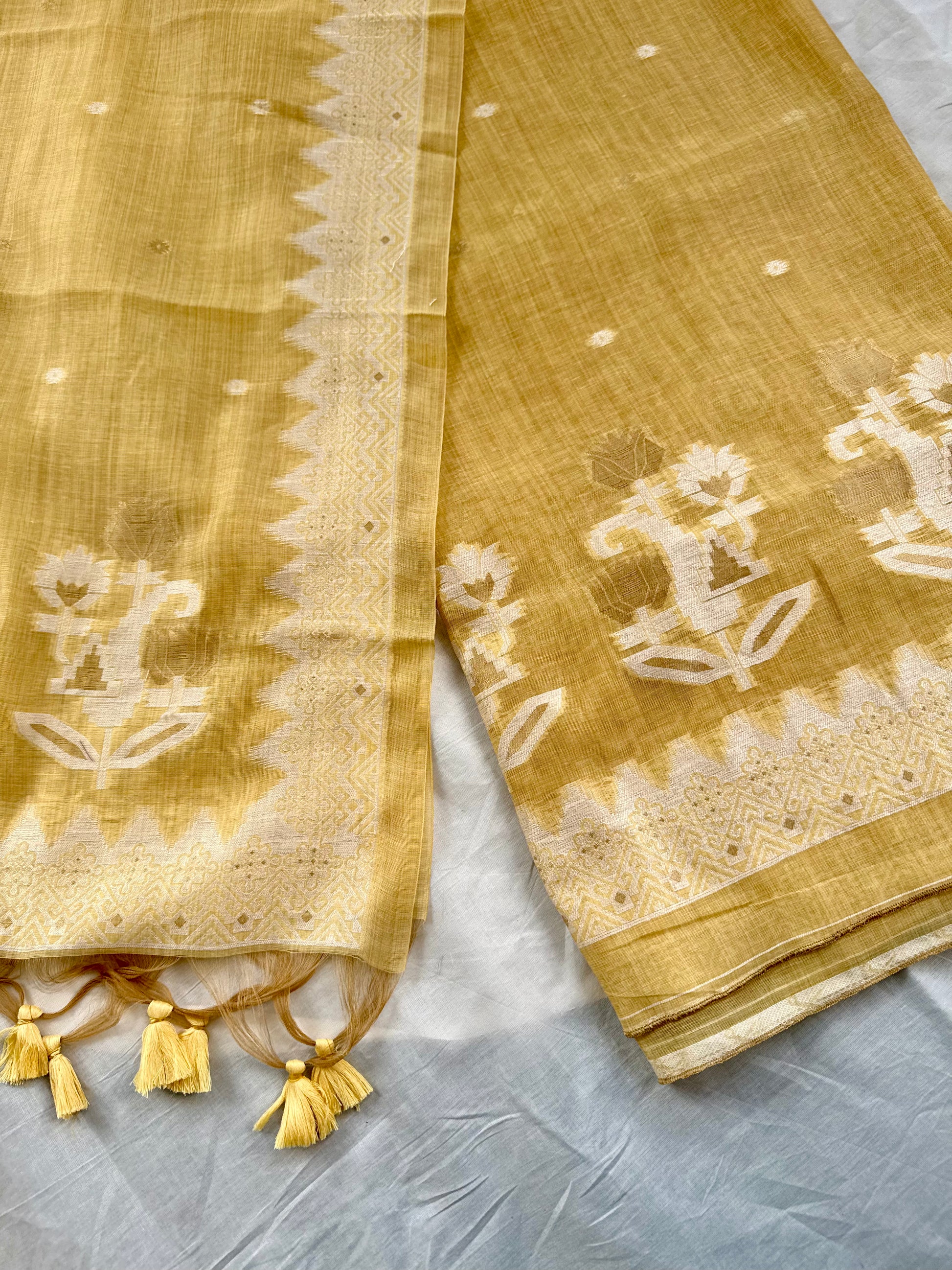 A stunning pure Jamdani suit set made from luxurious Maheshwari cotton. With its intricate weaving and soft, breathable fabric, this piece effortlessly blends traditional craftsmanship with modern comfort, perfect for any occasion.