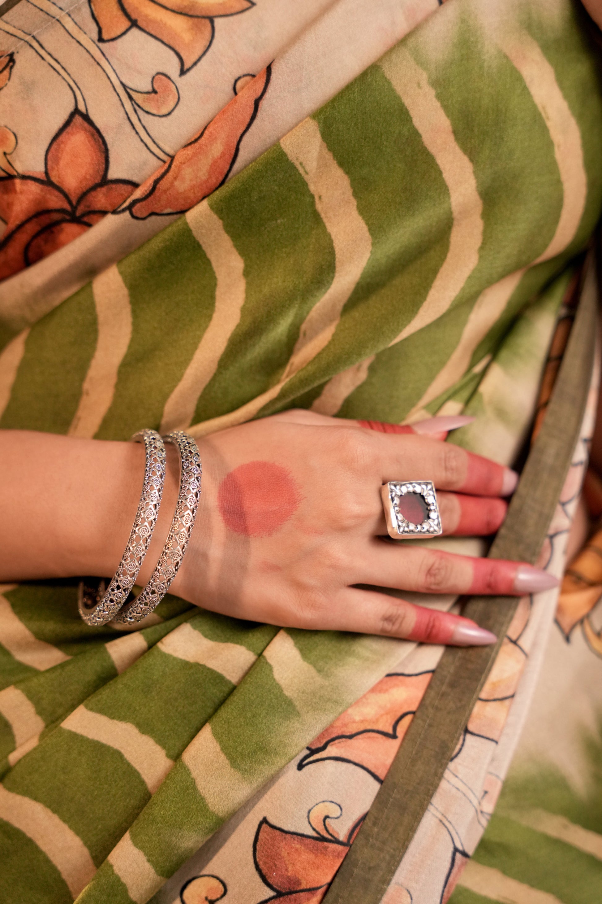 A saree that celebrates tradition in the most artistic way. Kumkum Katha fuses the timeless beauty of Bandhej with the storytelling artistry of a Kalamkari pallu.