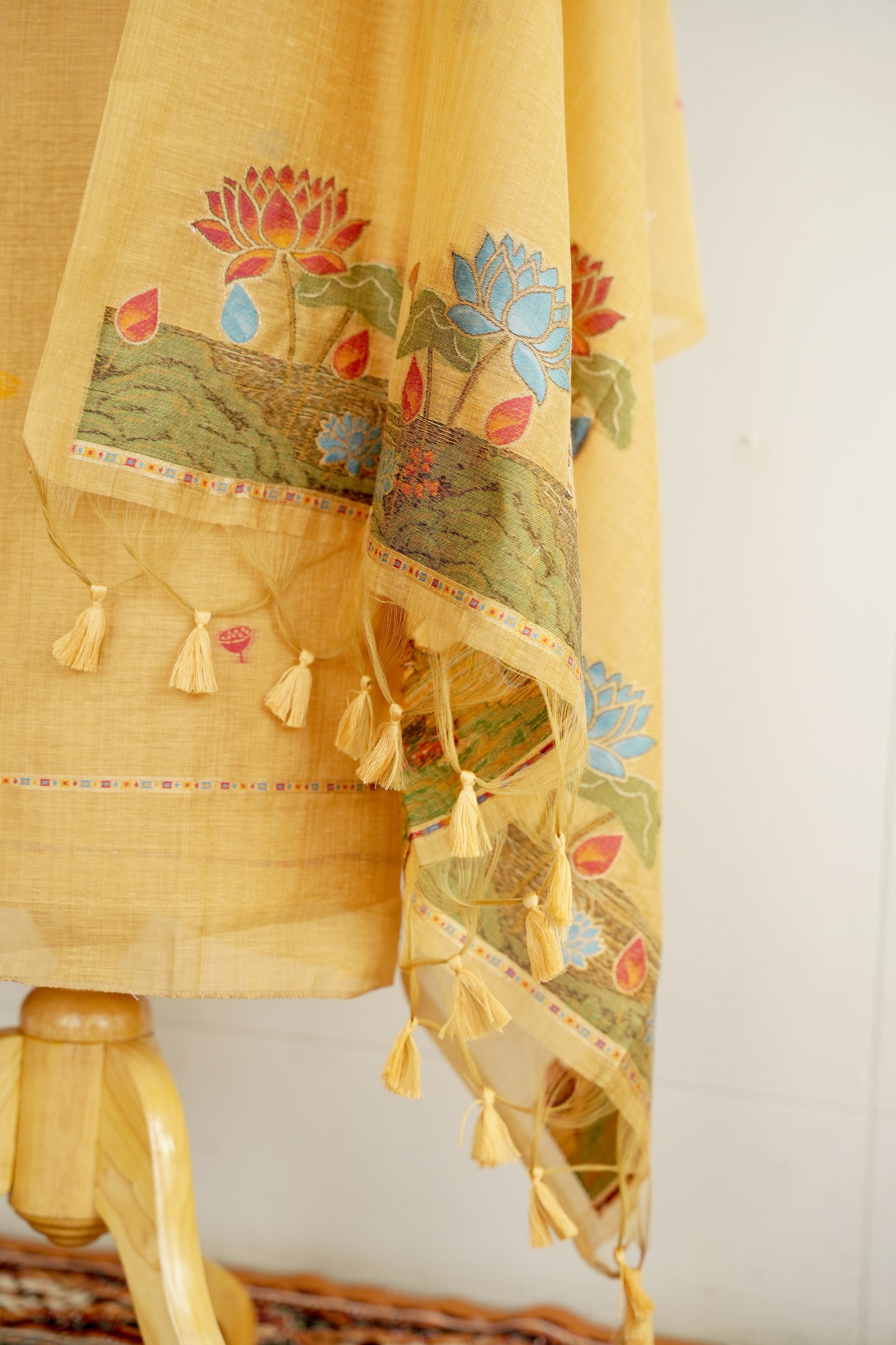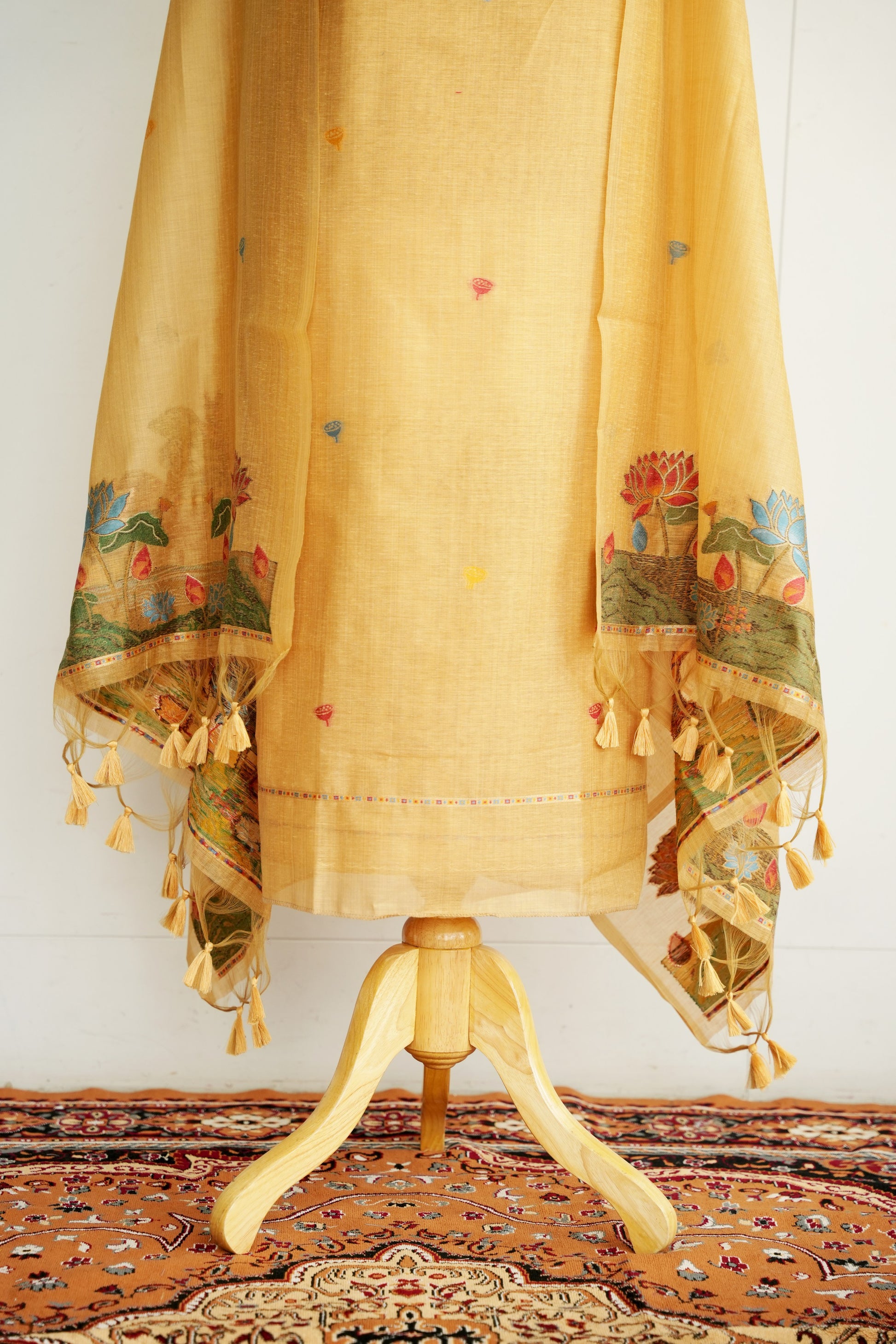 VRINDAVAN is crafted in pure Monga cotton, featuring warm golden tones inspired by blooming lotuses in Pichwai art. Light, breathable, and effortlessly elegant — a timeless piece for everyday grace and festive ease.
