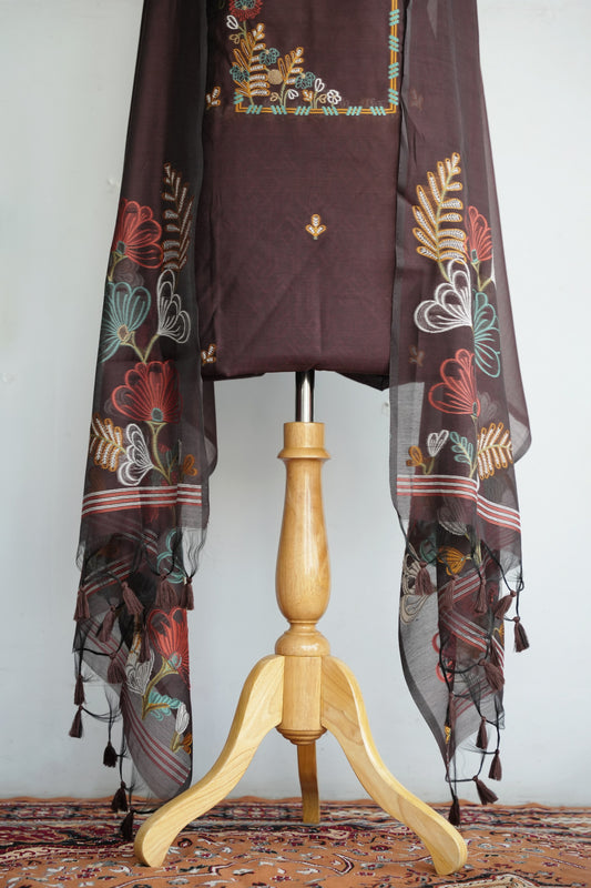 MOCHA MUSE- Pure Mul Chanderi Chocolate Brown Floral Unstiched Suit Set